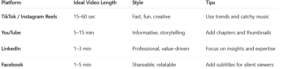 The optimal length varies with platform and intent. For short-form platforms such as TikTok or Instagram Reels, it is less than 60 seconds. For YouTube or educational videos, 5–10 minutes is optimal. The point is to make every second count.